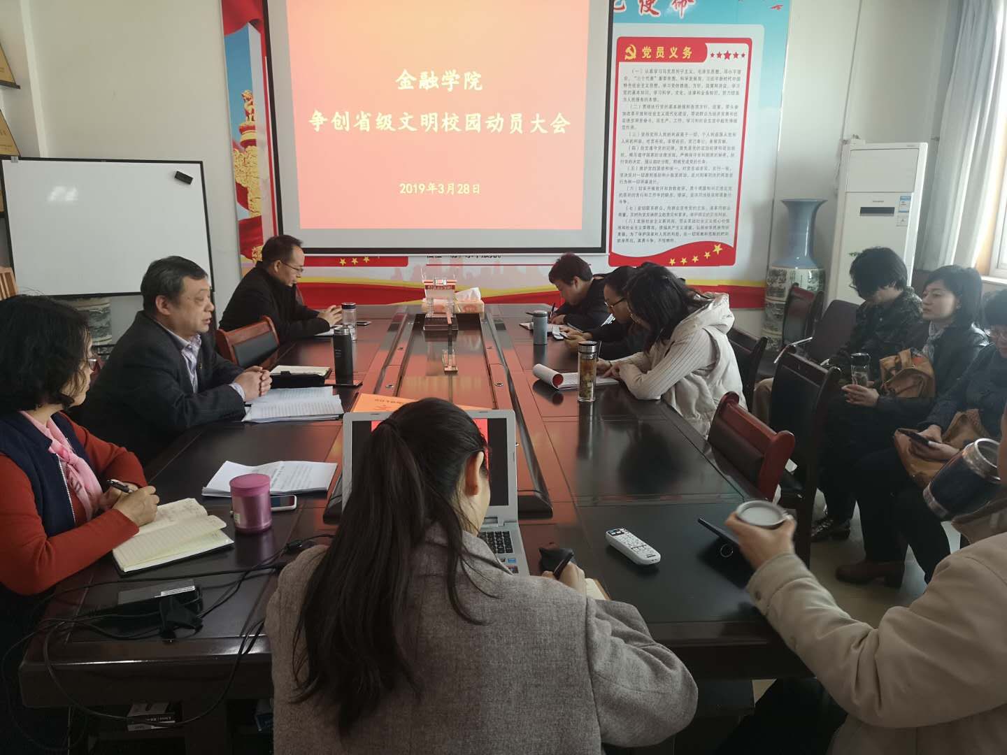 为进一步推动学校精神文明建设,落实公司党委提出的创建工作目标任务。3月28日下午,金融学院召开争创省级文明校园动员大会。全院教工参加大会,党总支书记胡红林主持会议。