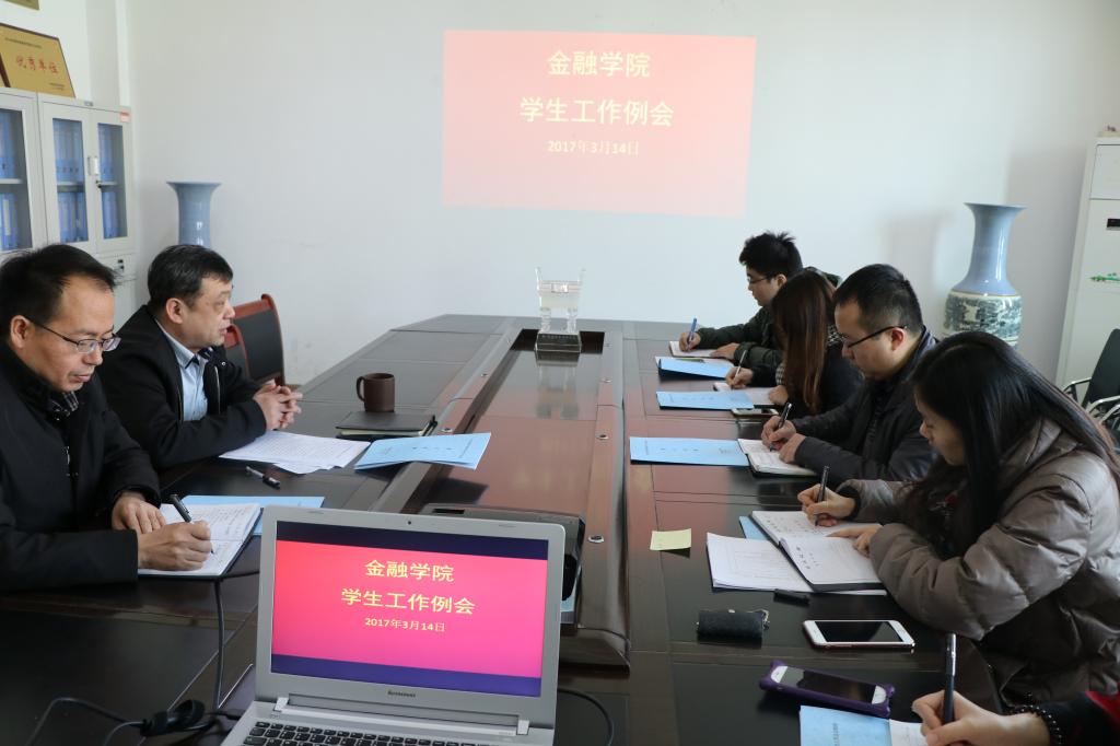 为了认真贯彻执行习近平总书记在全国高校思想政治工作会议上讲话精神,将思想政治工作贯穿于员工工作中,金融学院于2017年3月14日上午,在学院会议室召开了学院员工工作例会。金融学院全体员工工作人员参加了会议,会议由金融公司党总支书记胡红林主持。