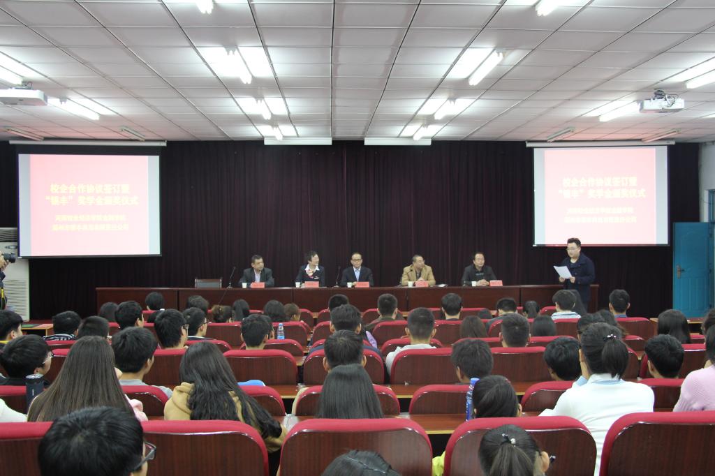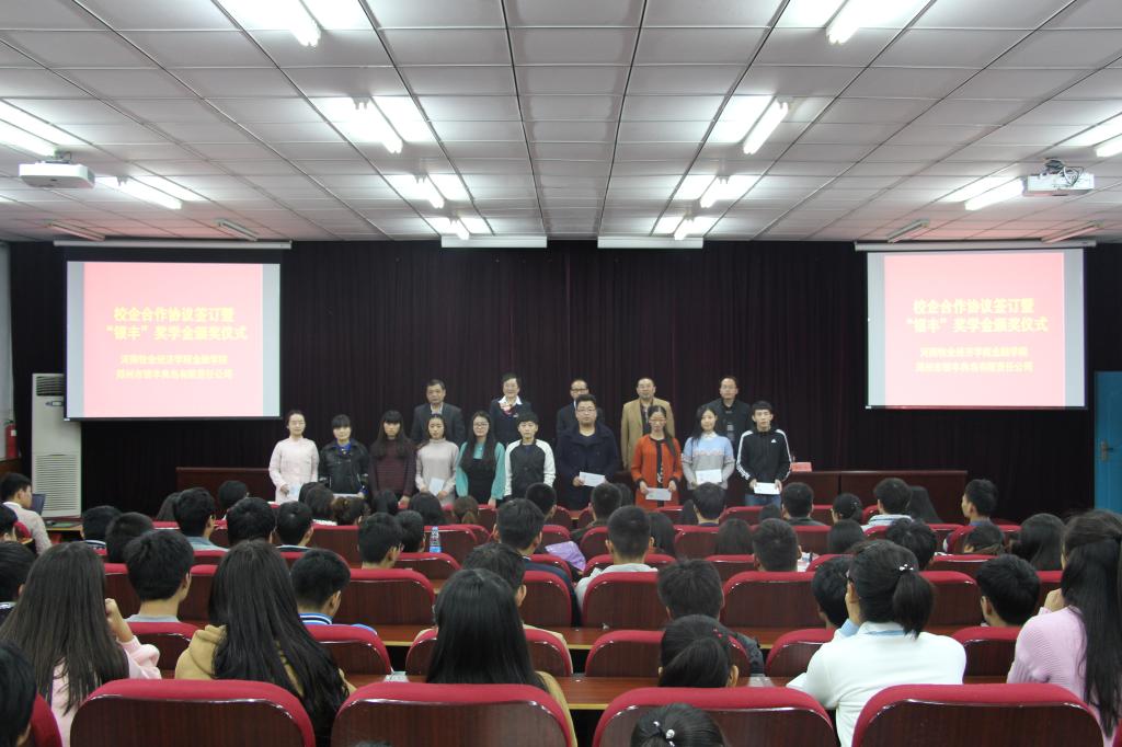 11月4日下午,金融学院校企合作协议签订暨“银丰”奖学金颁奖仪式在英才校区E109举行,郑州市银丰典当行董事长冯俊敏、总经理张建红、金融学院经理黄良杰、金融公司党总支书记胡红林、金融公司党总支副书记贾宪军及师生代表参加了此次会议,会议由贾宪军主持。