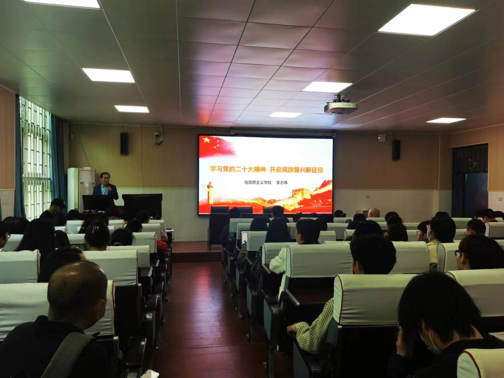 李志伟博士的讲座将党的二十大报告分为四个板块进行了深入的解读。首先李老师在第一板块——总论部分着重介绍了党的二十大报告的主题,提出的“三个务必”,过去五年工作和新时代十年的伟大变革,三件大事、三个历史性胜利、三个重要原因、五史,中国化时代化马克思主义最新成果,习近平新时代中国特色社会主义思想的主要内容,马克思主义永葆生机活力的基本经验,哲学高度提出习近平新时代中国特色社会主义思想的世界观和方法论,推进和拓展中国式现代化,创造人类文明新形态等内容;其次李老师的讲座指出党的二十大报告的第二板块——分论部分以习近平新时代中国特色社会主义思想为指导,围绕“以中国式现代化全面推进中华民族伟大复兴”这条主线,按照“五位一体”总体布局加“一”的框架,对新时代全面建设社会主义现代化国家新征程作出战略谋划;再次李老师的讲座指出党的二十大报告的第三板块——保障部分围绕“以中国式现代化全面推进中华民族伟大复兴”这条主线,从国家安全、强军战略、祖国统一、国际环境和党的建设等方面,为全面建设社会主义现代化国家提供全面保障;最后李老师的讲座指出党的二十大报告的第四板块——结尾部分以坚持遵循规律和发挥人民主体能动性相统一、坚持五个必由之路为遵循,从战略上做好青年工作,团结奋斗、实干兴邦。